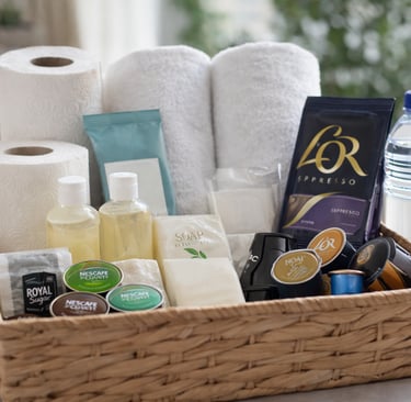 Kit de produits d’accueil (gel douche, café, essentiels…)